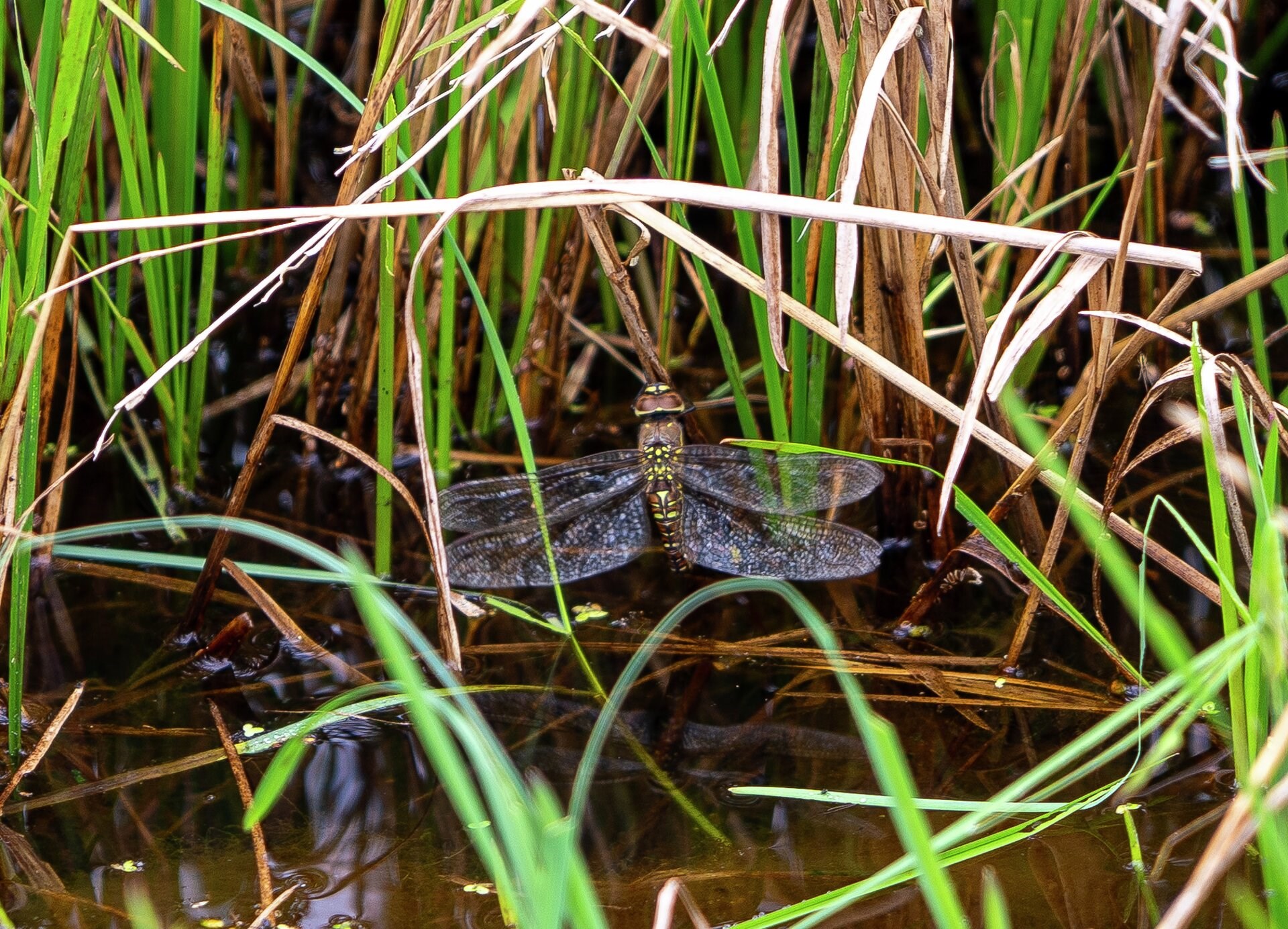 En brun mosaik guldsmed er ved at lægge æg i et af de vandhuller, som borgerne i Voerså bl.a. har etableret.