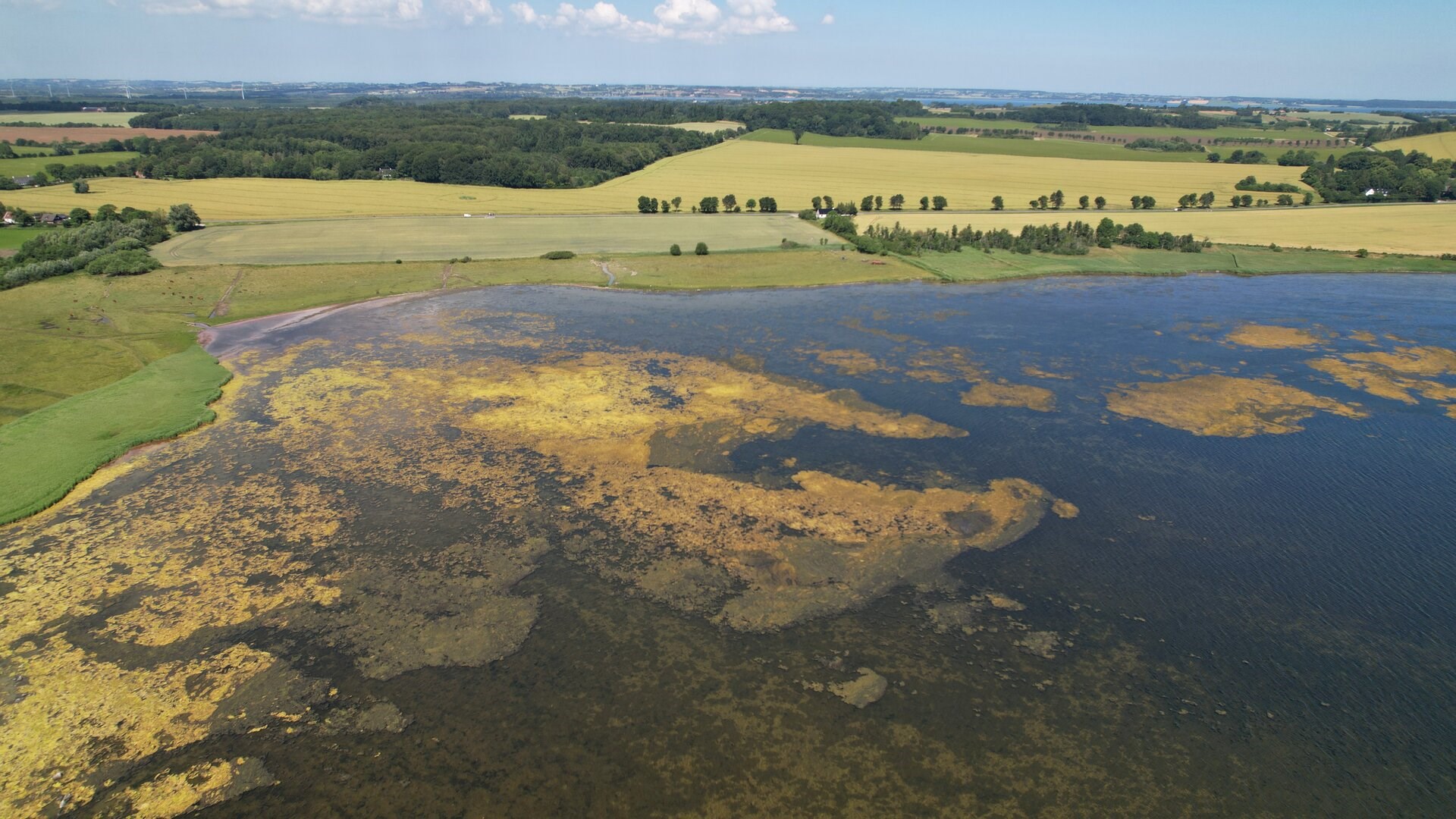 Kvælstof fra gylle og kunstgødning ender i Isefjord og det fører til opblomstring af store plamager af alger. Når algerne dør fører det ofte til dræbende iltsvind i fjordene. Foto: Jan Henningsen.